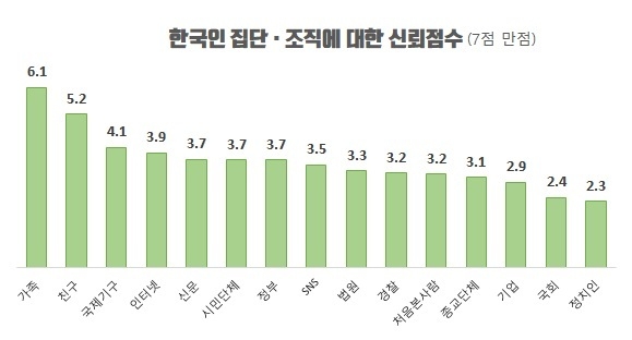 한국인들은 국회와 정치인을 가장 신뢰하지 않는다. 한 사회연구기관의 지난해 조사에 따르면 한국인들은 국회와 정치인의 신뢰에 대하여 7점 만점에 각각 2.4점과 2.3점을 줬다. 조사 대상 집단 중 두 집단이 나란히 꼴찌를 했다.
