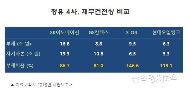 SK이노베이션이 86.7%로 뒤를 잇고 현대오일뱅크가 119.1%, S-OIL이 146.6%로 뒤를 이었다. 지난해 정유사들이 모두 큰 이익을 냈지만 배당을 워낙 많이 하다보니 자기자본이 늘지 않고 심지어 줄기까지 해 부채비율을 줄이지 못한 것으로 분석된다.