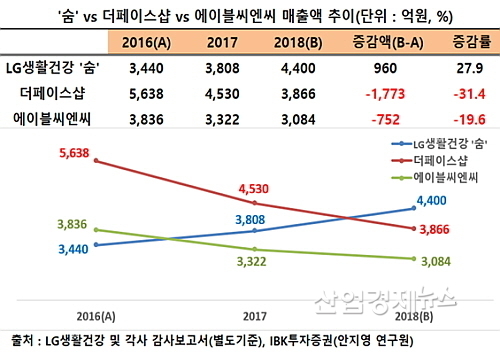 LG생활건강과 더페이스샵, 에이블씨엔씨의 각 감사보고서(별도재무제표기준)및 IBK투자증권 안지영 연구원 보고서에 의거, 숨의 지난 2016년 이후 지난해까지 3년간 매출 추이를 각사 실적과 비교해 보면 정반대의 사이클을 그리고 있다.