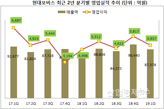 모비스는 지난 26일, 전자공시를 통해 1분기(연결기준) 매출액 8.7조원, 영업이익 4937억 원, 당기순익 4858억 원의 경영실적을 발표했다.