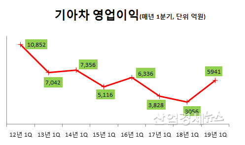 하지만, 판매량은 3년 전 2016.1Q 70.4만대 → 2019.1Q 64.9만대로 7.8%가 감소했고 같은 기간 영업이익도 6336억 원 → 5941억 원로 6.2% 감소했다.