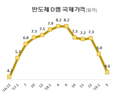 그리고 올해들어 6달러 선까지 하락한 반도체 가격은 지난 3월 4.6달러까지 떨어졌다. 지난해 9월 정점과 비교하면 반토막 수준이다.