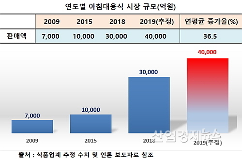 13일 식품업계와 언론사 보도 등에 따르면 아침 대용식시장은 지난 2009년 7천억 원대에서 2015년 1조 원대로 성장하더니, 급기야 지난해 약 3조원 규모(추정치)로 9년 만에 무려 328.6%나 급증했다.