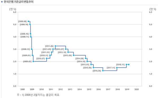한국은행은 기준금리를 2014년 10월 15일 2.0%에서 2015년 3월 12일 1.75%로 인상했고 그해 6월 11일 다시 1.5% 그리고 2016년 6월 9일 1.25%로 계속 인하했다.