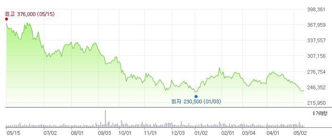 지난 연초 대규모 적자 발표 때 23만원으로 1년래 최저점을 찍고 이후 상승 곡선을 그리다가 지난 4월말 커다란 이익 증가를 발표하자 오히려 주가는 하락해 14일 현재 23만9500원으로 마감하면서 다시 23만원대로 하락했다.