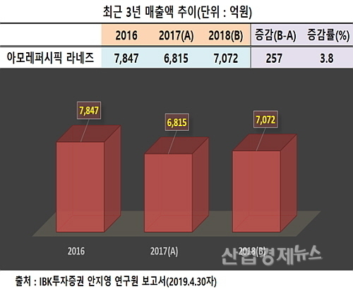 IBK투자증권 및 아모레퍼시픽에 따르면 라네즈는 지난해 단일 브랜드 기준 7072억 원의 매출을 올려 2017년 6815억 원 대비 약 3.8% 늘어 상승 반전됐다.