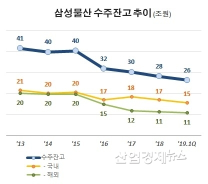삼성물산의 수주잔고 추이를 보면, 2013년 41조원에 달해 연간 매출액의 3배가 넘는 수주잔고를 보유하고 있었지만, 2016년 32조원으로 급감하더니 이후 계속 줄어들어 올해 1분기에는 26조원밖에 남지 않았다.