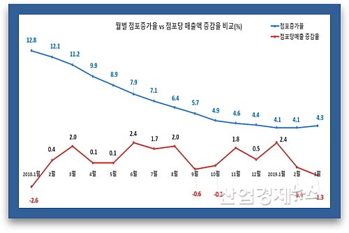 구체적으로 보면 2018년 1월부터 올 3월까지 13개월간 전년 동월대비 점포수 증가율은 2018년 1월 12.8%를 고점으로 매월 하락하더니 올 1월 4.1%로 최저치를 기록했다.