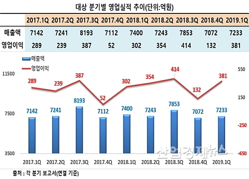외형 감소와 달리 영업이익은 2018년 1분기 302억 대비 26.1% 증가한 381억 원을 시현해 대조를 보였다. 이는 역대 1분기 기준 최대치에 해당하는 호실적이다.
