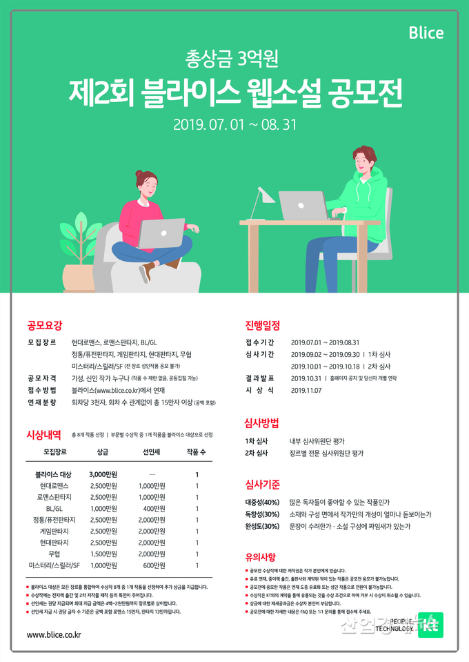 KT 전대진 상무는 “작년에 이어 올해로 두 번째를 맞는 이번 블라이스 공모전에서 로맨스, 판타지와 같은 인기 장르 외에 미스터리, 스릴러, SF 등 비인기 장르에서도 우수한 작품을 발굴해 1인 창작자들을 지속적으로 육성, 지원하겠다”고 말했다.