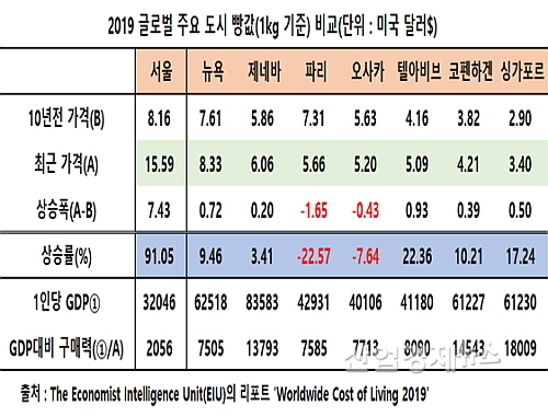 영국의 경제분석기관 이코노미스트 인텔리전스 유닛(EIU)이 지난 3월 발표한 전 세계 주요 도시의 ‘2019년 세계 생활비 보고서’(Worldwide Cost of Living 2019)에 따르면, 서울의 빵 1kg 기준 평균가격이 미국 달러화 기준 15.59$에 달해 세계에서 가장 비싼 것으로 조사됐다.