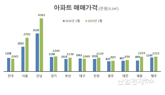 하지만 강남아파트의 가격은 2016년 2월 3120만원에서 올해 2월 4365만원으로 39.9%가 증가했다. 3년 전 3배 차이나던 전국 평균 아파트 값과 강남 아파트 값 차이는 올해 4배 이상으로 커졌다.