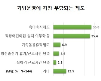 이 조사에 따르면 기업들은 육아휴직제도와 어린이집설치 등 제도가 기업에 가장 부담이 된다고 응답했다.