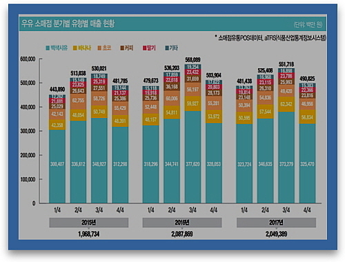 한국농수산식품유통공사(aT)에서 지난 3월말 발간한 식품산업통계 자료에 따르면 2017년 기준 국내 우유 소매시장 규모는 2조494억 원으로 2015년 1조9687억 원에 비해서는 4.1% 증가했지만, 2016년 2조879억 보다는 약 1.8%가 감소해 성장세가 꺾이는 모양새를 연출했다.