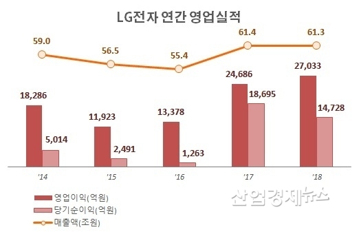 LG전자의 최근 5년 연간 영업이익을 살펴보면 2014년부터 2016년까지 3년 동안은 영업이익이 2조원을 넘기지 못했다. 2015년과 2016년에는 1조원 초반대에 머무르며 당기순이익은 1000~2000억원에 불과했다.
