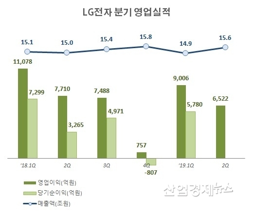 LG전자는 5일 연결재무제표 기준 2019년 2분기 잠정 실적을 공시했다. 매출은 15조6301억원으로 전년 동기보다 4.1% 증가했지만 영업이익은 6522억원으로 전년 동기보다 15.4%나 줄었다.