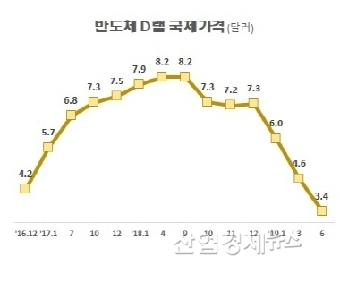 국제 반도체 가격은 2016년까지도 D램 기준, 4.2 달러 수준이었지만 2017년 갑자기 치솟기 시작해 7달러를 넘어섰다.