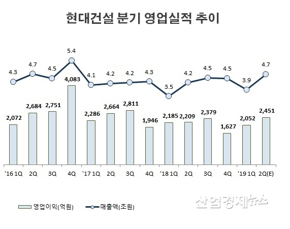 현대건설은 지난 25일 2019년 2분기 잠정실적을 발표했다. 매출은 4조 6819억원으로 전년 동기보다 10.4% 증가했고 영업이익은 2451억원을 실현해서 11.0% 증가했다.