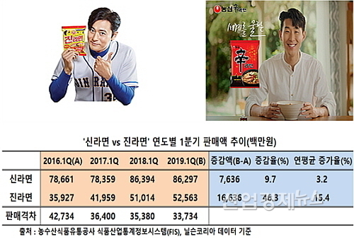 한국농수산식품유통공사의 식품산업통계정보시스템(FIS, 닐슨코리아 수치)에 따르면 올 1분기 이들 제품의 국내 판매액은 신라면이 지난해 1분기 863억94백만 대비 약 97백만 원 감소한 862억97백만 원을 시현한 반면에,