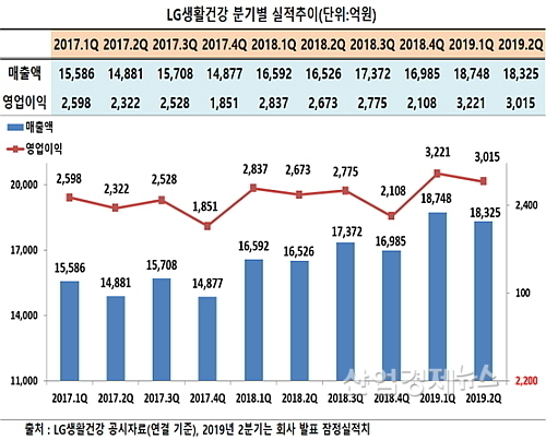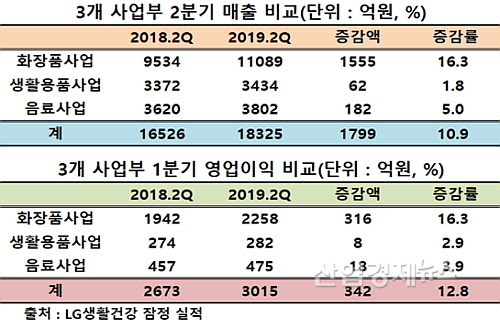 LG생활건강이 최근 공시한 잠정실적(연결 기준)에 따르면 올 2분기 매출과 영업이익은 1조 8325억 원과 3015억 원을 시현, 지난해 2분기의 1조6526억 매출과 영업이익 2673억 원 대비 각각 10.9%와 12.8% 신장하는 호 실적을 기록했다.