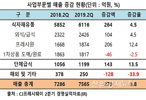 CJ프레시웨이가 최근 공시한 2분기 잠정실적에 따르면 연결재무제표기준 올 2분기 매출은 2018년 2분기 7286억 대비 약 3.8% 증가한 7565억 원을 시현, 창사 최대 분기매출 기록을 갱신했다.
