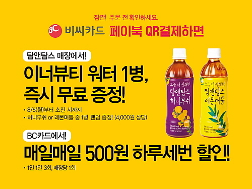 먼저 탐앤탐스는 BC카드(대표 이문환)와 손잡고 지난 5일부터 전국 탐앤탐스 매장에 ‘BC페이북 QR결제’ 시스템을 적용하고, 이를 기념한 이벤트를 진행한다.