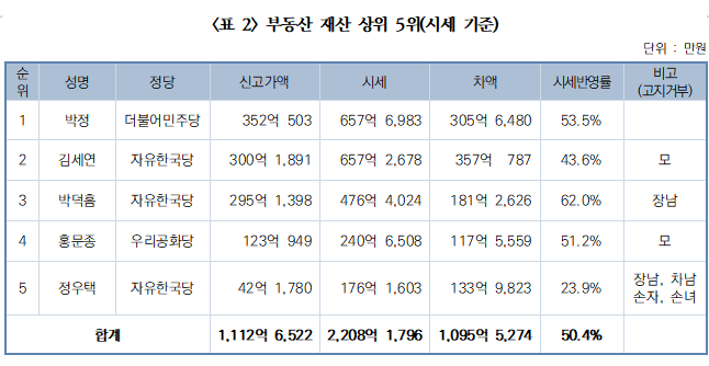 시세 기준 부동산이 가장 많은 국회의원은 △박정 더불어민주당 국회의원 657억 7천만원 △김세연 자유한국당 국회의원 657억 3천만원 △박덕흠 자유한국당 국회의원 476억 4천만원 △홍문종 우리공화당 국회의원 240억 6천만원 △정우택 자유한국당 국회의원 176억 2천만원으로 나타났다.