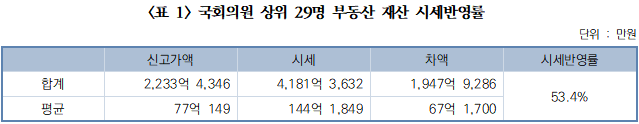 한편, 경실련은 이 자료의 분석기준으로 국회 공직자윤리위원회가 공개한 국회 관보의 부동산 공개현황을 토대로 시세와 비교했고, 시세는 최근 3년 이내 해당 필지 또는 주변 실거래가 평균값을, 아파트나 오피스텔 등은 국민은행(KB) 부동산 시세 자료를 활용했다고 밝혔다.