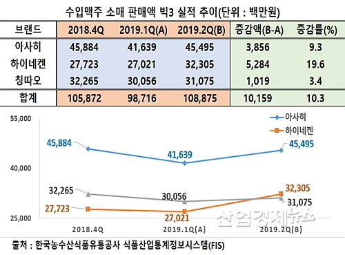 2019. 2Q 수입맥주 판매액, 아사히→하이네켄→칭따오 순...하이네켄 2위 도약