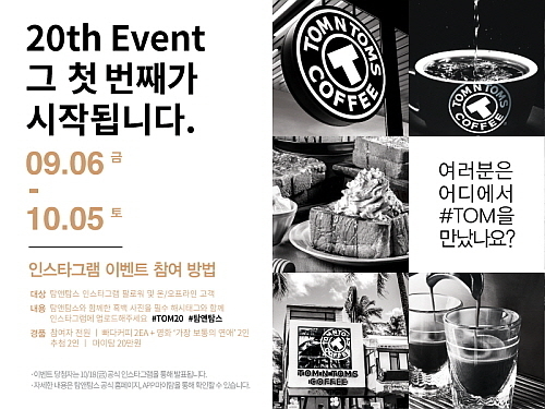 9월 6일부터 10월 5일까지 한 달간 ‘흑백 사진 공모전’을 개최하기로 한 것. 인스타그램을 통해 진행되는 이번 공모전은 20년간 탐앤탐스와 추억이 깃든 사진을 필수 해시태그 #TOM20 #탐앤탐스와 함께 흑백으로 올리면 응모가 완료된다.