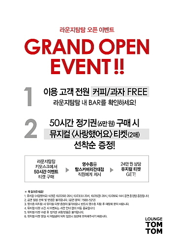 라운지탐탐 키오스크에서 ‘50시간 이벤트’ 이용권을 구매한 후 영수증을 직원에게 제시하면 현장에서 바로 24만 원 상당의 뮤지컬 티켓을 증정한다. 선착순 50명에게 제공하는 행사로 경품 소진 시 자동 종료된다.