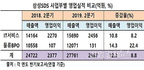 반기보고서에 의거해 양대 사업부의 2분기 실적을 살펴보면 먼저 IT서비스시업의 매출과 영업이익은 전년 동기대비 10.8%, 8.2%씩 늘었고, 물류BPO부문 역시 매출은 14.3%, 영업이익도 22.4%나 급증한 것으로 나타났기 때문이다.