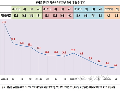 2Q 매출 증가율 3.9%, 2016년 1Q 대비 13분기 내리 하락...점포증가율은 횡보 양상