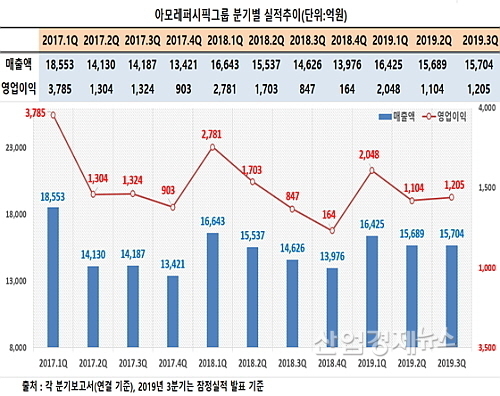 아모레퍼시픽그룹이 최근 발표한 잠정 영업실적에 따르면 연결기준 올 3분기 매출은 1조5704억 원으로 지난해 3분기 1조4626억 원 대비 약 7.4% 늘어난 반면에, 영업이익은 1205억을 시현, 전년 동기 847억 원 대비 42.3%나 급증, 모처럼 양호한 성적표를 시장에 내밀었다.
