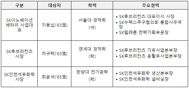 SK루브리컨츠 사장에는 차규탁 SK루브리컨츠 기유사업본부장이 신규 선임됐다. 또, SK인천석유화학 사장에는 최윤석 생산본부 본부장이 각각 신규 선임되었다.우선, SK에너지는 주유소 등을 플랫폼으로 한 신사업 개발을 강화하기 위해 B2C사업본부로 플랫폼 개발TF를 이관, 주유소 자산과의 연계를 통한 시너지 창출을 극대화할 계획이다.