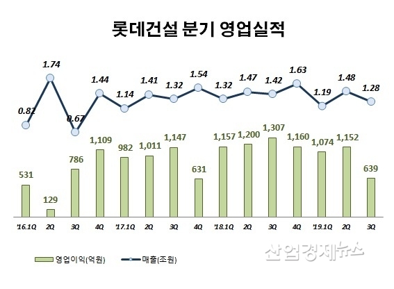 롯데건설은 지난해 3분기 영업이익이 1307억원을 기록하며 역대 최고 이익을 실현했다. 하지만 올해 들어 오면서 매출과 영업이익이 감소하는 모습을 보이고 있다.