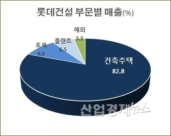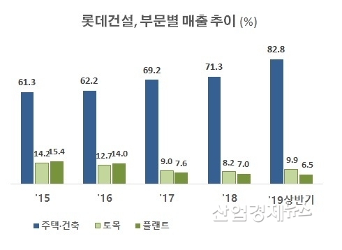 롯데건설의 2015년 주택건축 매출 비중은 61.3%였다. 하지만 2016년 62.2%로 증가했고 지난해에는 71.3%로 70%를 넘어섰다. 그리고 올해 상반기에는 82.8%로 정점을 찍었다.
