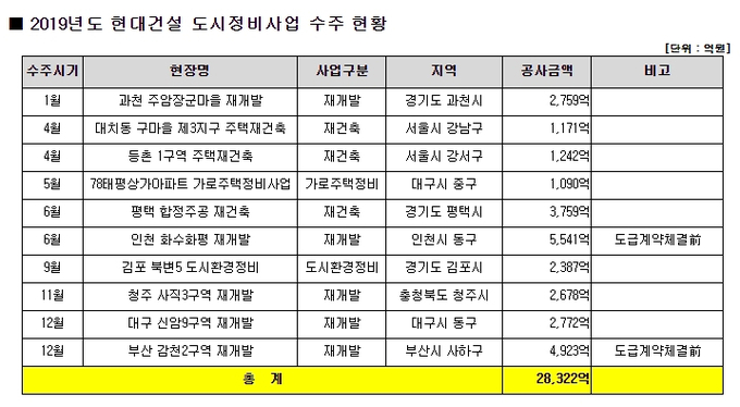 올해 현대건설은 서울 2건(대치동 구마을3 재개발․등촌1구역 재건축), 수도권 4건(과천 주암장군마을 재개발․인천 화수화평 재개발 등), 지방 4건(청주 사직3구역 재개발․대구 신암9구역 재개발 등) 전국에 걸쳐 총 10건의 사업을 수주해 2조8,322억원이라는 독보적인 도시정비사업 실적을 기록했다.