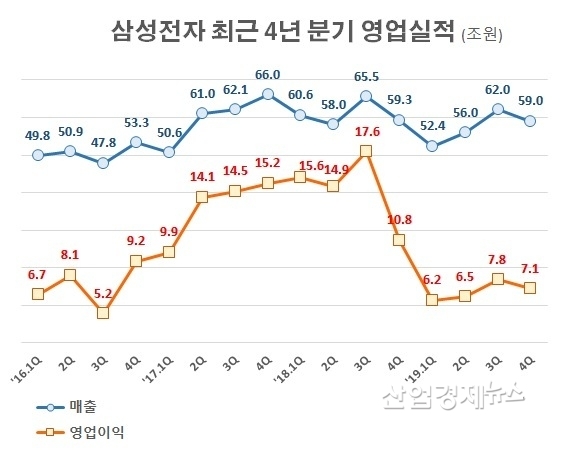 지난해 4분기 연결기준 매출은 59조원을 기록했고, 영업이익은 7조원을 기록했다. 매출은 전년 보다 0.5% 감소했지만, 영업이익은 34.3% 감소한 실적이다.