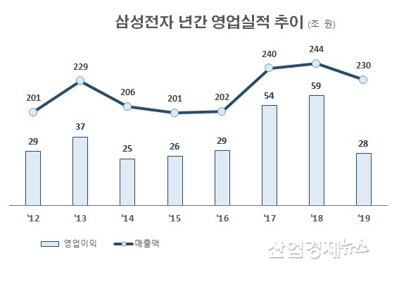 2019년 연간 매출은 230조원으로 전년 244조원보다 5.9% 감소했지만, 영업이익은 28조원으로 2018년 59조원보다 53.0%가 감소해 절반 이하로 축소됐다.