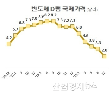 반도체 가격은 지난해 초까지만 해도 6달러 선을 유지했지만 상반기를 지나면서 3달러 대로 떨어지더니 하반기에는 2달러 수준까지 하락했다.