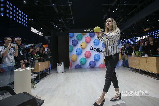 삼성전자 프로모터가 지능형 컴퍼니언 로봇 '볼리'를 소개하고 있다.