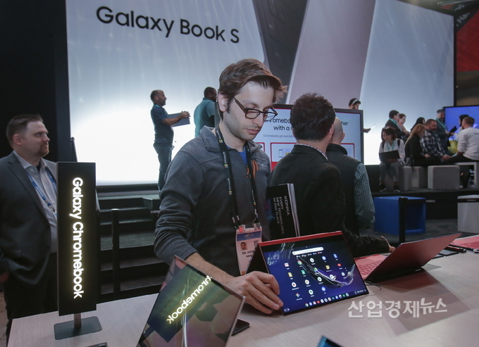 갤럭시 체험관에서 관람객이 '갤럭시 크롬북'을 직접 시연해 보고 있다.