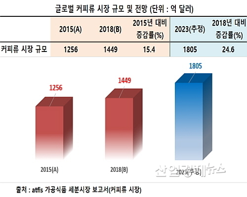 aT(한국농수산식품유통공사)의 ‘2019 가공식품 세분시장 현황‘에 따르면, 시장조사기관 글로벌데이터 기준 전세계 커피류 시장규모는 2015년부터 지속 증가하며 2018년 기준 1449억 달러(성장률 15.4%)에 달했다.