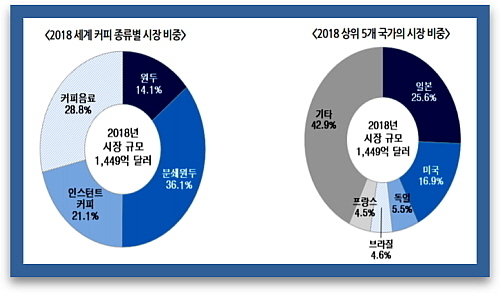 [엔트로피타임즈 민혜정 기자] 지난 2018년 기준 전세계 커피류 제품 시장 규모는 2015년 1256억불 대비 약 15.4% 성장한 1449억 달러(미국 달러화 기준)로, 이중 그 규모가 가장 큰 나라는 일본인 것으로 조사됐다.