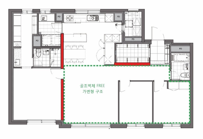 3개의 내력 벽을 안방과 거실, 주방을 구분하는 곳에 T자 형태로 배치하여 안방과 주방, 욕실을 제외한 나머지 공간을 자유롭게 구성할 수 있다. 개인의 라이프스타일 혹은 가족 구성에 따라 원룸 형태의 확 트인 공간으로 연출하거나 다양한 목적의 공간으로 쪼개는 등 자유롭게 공간 연출이 가능하다.