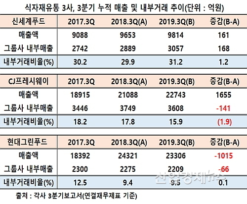 내부거래비율 추이, CJ프레시웨이와 현대그린푸드 대비 2~3배↑