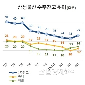 수주잔고도 2013년에 41조원까지 증가했지만 이후 계속 감소해서 2018년에는 28조원까지 감소했고 2019년말에도 27조원으로 또 감소하는 실적을 보였다.