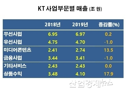 KT는 매출 중 가장 큰 비중을 차지하는 무선사업의 매출이 증가한 것에 방점을 뒀다. 무선사업 매출은 전년대비 0.2% 증가한 6조 9707억원이다.