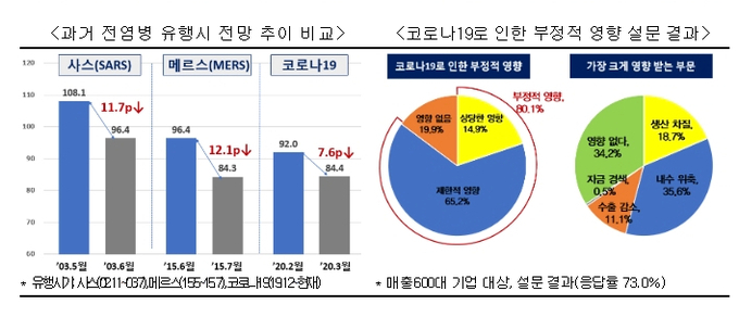 한경연은 3월 전망치가 전달 대비 7.6p 하락하면서 사스(△11.7p)·메르스(△12.1)에 비해 하락수치가 절대적으로는 작을 수 있으나, 코로나19의 진행 상황에 따라 그 영향이 과거보다 더 클 수도 있다고 전망했다.